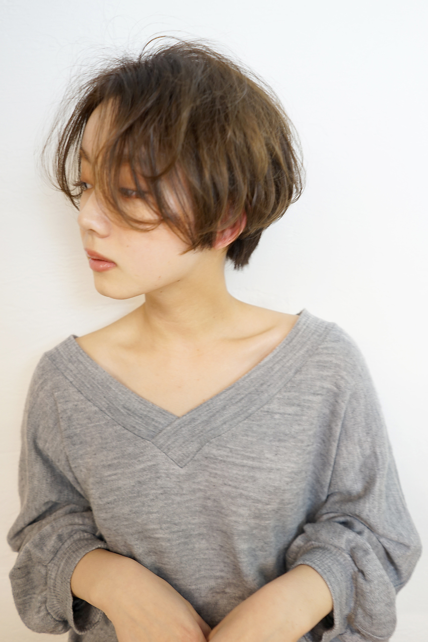 前髪を長めに残した前下がりショート。顔周りに長さを残して小顔に!